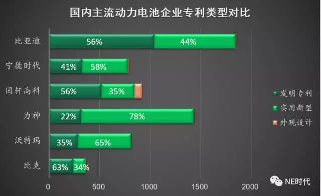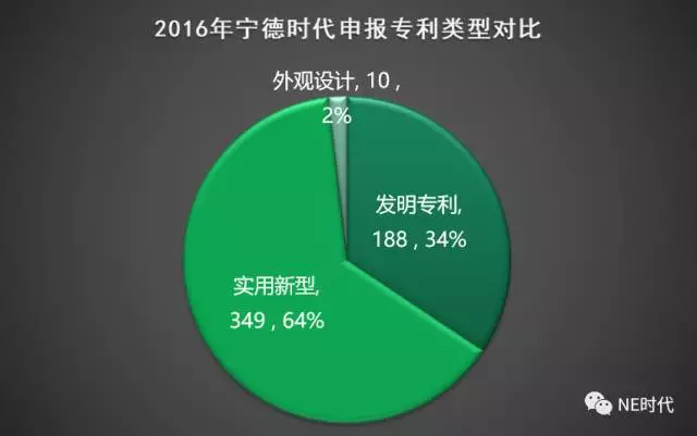 通過檢索2016年寧德時(shí)代申請(qǐng)的所有專利,發(fā)現(xiàn)中國(guó)申請(qǐng)專利553件,同時(shí)還有國(guó)際申請(qǐng)專利6件。而在國(guó)內(nèi)申請(qǐng)的專利中,發(fā)明專利188件,實(shí)用新型專利349件,外觀專利10件,這與上一期中國(guó)軒高科發(fā)明專利和外觀設(shè)計(jì)專利偏多的情況有很大的不一樣。