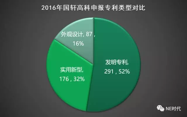 為了更全面的分析,我們?cè)趯@麢z索詞里面去掉了電池這個(gè)關(guān)鍵詞,只設(shè)定了“專利申請(qǐng)人-國(guó)軒高科 + 申請(qǐng)時(shí)間- 2016”檢索條件,最后共檢索出來555篇專利。其中發(fā)明專利292件,實(shí)用新型專利176件,外觀設(shè)計(jì)專利87件。