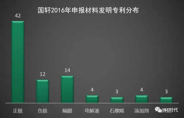 筆者對(duì)所有的材料發(fā)明專利進(jìn)行了分析和分類,發(fā)現(xiàn)其中正極材料的專利最多,有42篇。其次是隔膜專利,共14篇。負(fù)極材料相關(guān)專利12篇。而電解液只有4篇。另外還有少量的溶劑、導(dǎo)電劑、集流體、石墨烯等專利。從中我們可以發(fā)現(xiàn),國(guó)軒在材料的自主研發(fā)方面主要布局在正極、負(fù)極和隔膜。