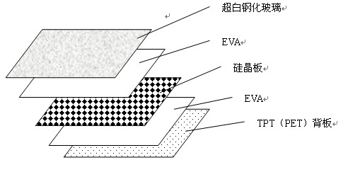 圖示的玻璃、 EVA、TPT、硅晶片是組成太陽電池組件的主要材料,此外,互連條、鋁合金邊框、接線盒、焊錫、密封硅膠也是組成電池組件不可缺少的部件。