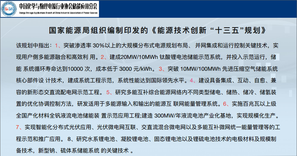 未來十年的發(fā)展目標(biāo),整個文件里面都有,我簡單羅列了一下,2020年實(shí)現(xiàn)儲能示范應(yīng)用向商業(yè)化過渡,推動儲能產(chǎn)業(yè)進(jìn)入規(guī)模化發(fā)展初期階段。要建成一批不同科技路線、不同應(yīng)用場景的示范項(xiàng)目,研發(fā)一批重大關(guān)鍵技術(shù)與核心設(shè)備、初步建立儲能技術(shù)標(biāo)準(zhǔn)體系,形成一批重點(diǎn)技術(shù)規(guī)范和標(biāo)準(zhǔn)。到2025年,儲能產(chǎn)業(yè)呈現(xiàn)規(guī)?;l(fā)展,努力成為支撐未來電力體系的關(guān)鍵技術(shù),切實(shí)成為推動能源變革的重要支撐力量。將在具有自主知識產(chǎn)權(quán)的關(guān)鍵裝備技術(shù)、應(yīng)用規(guī)模、商業(yè)模式和產(chǎn)業(yè)體系等方面形成較強(qiáng)的國際競爭力。