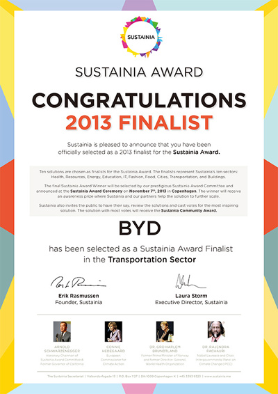 Sustainia是一個由國際組織、企業(yè)及專家組成的全球性聯(lián)盟,旨在通過選拔和推廣各行業(yè)中的優(yōu)秀可持續(xù)解決方案,使可持續(xù)戰(zhàn)略更具體、更容易被決策者和民眾掌握,進而促進可持續(xù)發(fā)展。Sustainia獎項的評審成員包括美國加州前州長阿諾德.施瓦辛格(ArnoldSchwarzenegger),聯(lián)合國政府間氣候變化專門委員會IPCC的主席拉金德拉.帕喬里(RajendraK.Pachauri),挪威前首相布倫特蘭夫人(GroHarlemBrundtland),以及歐盟氣候變化方面最高負責人、氣候事務委員康妮.赫澤高(ConnieHedegaard)等。