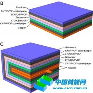 研究人員使用碳納米管(CNT)包覆的紙作為集流器,將傳統(tǒng)的活性物質層(Li4Ti5O12和LiCoO2)置于集流器頂部。使用實驗室用擦拭紙作為基底,因為其薄而多孔的特性允許CNT墨水輕易滲透紙的內(nèi)外層,使CNT包覆的紙每一面都具有導電性。
