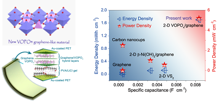 針對上述挑戰(zhàn),我校謝毅教授課題組與美國德克薩斯大學(xué)-奧斯汀分校余桂華教授合作,提出了利用具有高電化學(xué)活性的磷酸氧釩二維超薄結(jié)構(gòu)設(shè)計(jì)二維雜化組裝薄膜來構(gòu)筑柔性超級電容器的新途徑,獲得了氧化還原電位(~1.0V)接近純水電化學(xué)窗口電壓(1.23V)的贗電容柔性平面超級電容器。博士生盧秀麗、本科生彭樂樂等人通過選擇性溶劑超聲,制備出具有幾層原子厚度的磷酸氧釩超薄二維結(jié)構(gòu)。為了解決具有電學(xué)絕緣性的磷酸氧釩在電極中的電子傳導(dǎo)問題,他們通過氫鍵作用使二維超薄磷酸氧釩集成在石墨烯片層之上形成二維雜化結(jié)構(gòu),再將這種二維雜化結(jié)構(gòu)通過層層組裝形成薄膜電極,這樣組裝出薄膜的電導(dǎo)率達(dá)1.6´10-1 W?cm,比純的二維磷酸氧釩超薄薄膜的電導(dǎo)率提高了8個(gè)數(shù)量級。新設(shè)計(jì)的組裝結(jié)構(gòu)不僅完美體現(xiàn)了磷酸氧釩的高電化學(xué)活性,又解決了薄膜電極的導(dǎo)電性問題,因此構(gòu)建出的柔性薄膜型超級電容器的比容量高達(dá)8360.5 μF?cm-2,能量密度達(dá)1.7 mWh?cm-2,功率密度達(dá)5.2 mW?cm-2,是目前為止最優(yōu)能量密度的柔性超級電容器。該項(xiàng)研究對于推動(dòng)能源存儲(chǔ)領(lǐng)域進(jìn)展具有重要的科學(xué)意義和實(shí)用價(jià)值,也為研究尺度受限的二維超薄結(jié)構(gòu)的電性能開辟了新的途徑。