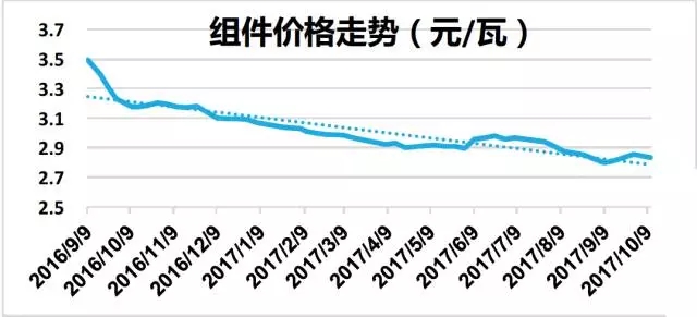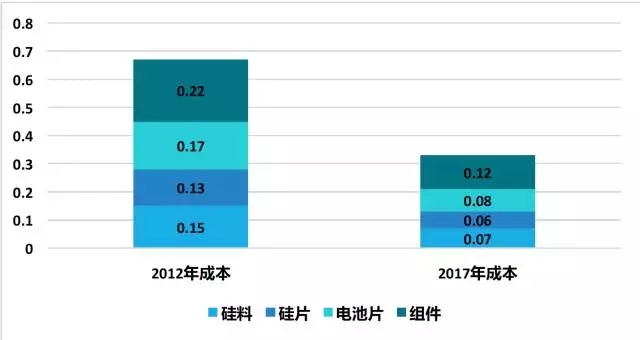 組件、系統(tǒng)、逆變器、電價8年分別下降90%、88.3%、91.5%、77.5%;2016-2017年,組件價格下降幅度也達到近21%,系統(tǒng)的設備投資成本也下降至5元/瓦的水平。