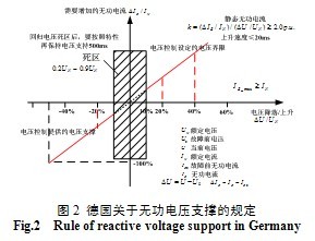 西班牙和德國早在2008年前后就出臺了新能源并網(wǎng)時的低電壓穿越要求[11]。德國的標準還詳細規(guī)定了無功電流和電壓跌落的關(guān)系,如圖2所示。