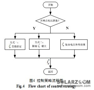 圖中,控制器檢測并網(wǎng)點電壓是否跌落,若電壓跌落,則斷開電壓外環(huán),在電流內(nèi)環(huán)直接給定輸出不過流時的id值作為參考值,可用正常運行時id=1作為參考值,也可以用小于1的值作為參考值從而減小id,降低有功功率輸出;另一種方法是用逆變器正常運行時的id=1作為限制值,通過限幅環(huán)節(jié)限制住i*d的增大,從而限制住id的增加。若檢測到電壓沒有跌落,則i*d繼續(xù)取自電壓外環(huán)計算出的結(jié)果。