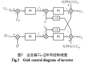 逆變器通過MPPT算法得到Udc_ref,該參考值與直流側(cè)電壓之間的誤差信號經(jīng)過PI調(diào)節(jié)得到內(nèi)環(huán)的電流d軸分量參考值i*d,i*d與逆變器出電流d軸分量之間的誤差信號經(jīng)過電流環(huán)PI調(diào)節(jié)、dq解耦過程后得到逆變器PWM調(diào)制波Ud;同理控制無功功率,無功功率的給定值為Qref。