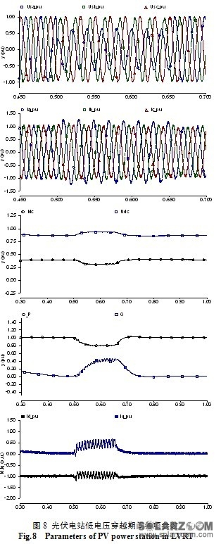 通過計算也可知道,光伏電站發(fā)出的無功電流為0.46pu,網(wǎng)側(cè)電壓跌落到0.2pu,則光伏電站向電網(wǎng)發(fā)送的無功功率為0.46*0.2≈0.092pu,也與實測的無功功率(約0.1pu)一致。