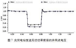 圖7是光伏電站發(fā)送無功功率前后并網(wǎng)點電壓的對比。由圖中可見,光伏電站能通過發(fā)送無功功率,把并網(wǎng)點電壓從0.2pu提升到約0.35pu。