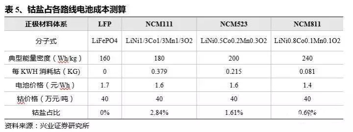 預(yù)計(jì)鈷價(jià)上漲對(duì)三元電池影響有限。雖然目前高鎳三元材料市場(chǎng)份額逐步提高,但絕大部分廠商已進(jìn)入從532向622轉(zhuǎn)移的階段,未來過渡到811后,單位用鈷量將明顯減少。根據(jù)前述測(cè)算,高鎳NCM811路線中鈷鹽占售價(jià)比不到1%,因此未來高鎳三元時(shí)代到來后,鈷價(jià)上漲將不會(huì)對(duì)降成本起到太大影響。