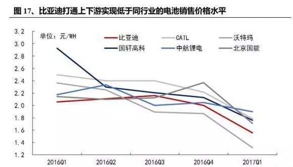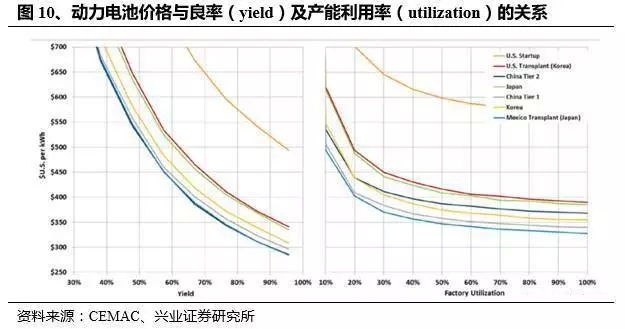 電池售價(jià)與產(chǎn)能利用率(下稱Ut)的關(guān)系分為幾個(gè)階段,產(chǎn)能利用率小于20%時(shí),電池價(jià)格隨著Ut提升快速下降,而之后相對(duì)平緩,Ut在50%時(shí)對(duì)應(yīng)價(jià)格在350美元/KWH,90%對(duì)應(yīng)330美元/KWH??紤]到15/16年Ut已經(jīng)達(dá)到相對(duì)的高點(diǎn),這一塊未來的空間比較有限。興業(yè)證券認(rèn)為不必過度擔(dān)憂產(chǎn)能過剩導(dǎo)致Ut下降,原因在于未來幾年的產(chǎn)業(yè)高景氣度使得Ut保持在50%以上問題不大,而50%-100%區(qū)間內(nèi)售價(jià)相對(duì)于Ut的敏感性已經(jīng)不強(qiáng)。