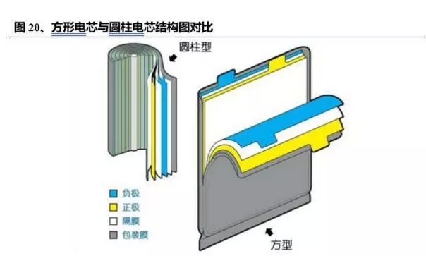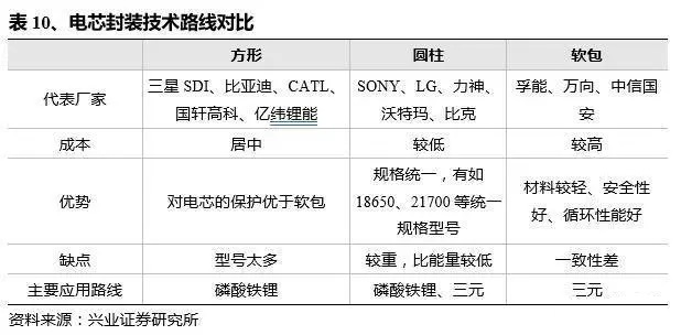 電芯封裝方式按軟包、方形與圓柱分,成本也有所區(qū)別。其中,圓柱最低,軟包最高。主流大廠中CATL與比亞迪走方形路線,力神、比克走圓柱路線,國軒高科同時(shí)走方形與圓柱路線,同時(shí)CATL也在積極拓展軟包路線。