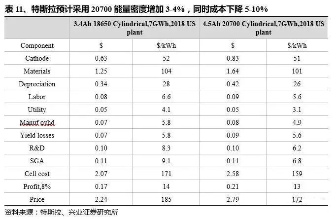 降成本方向:做大單體電芯。特斯拉已經(jīng)Model3中用20700替代18650電芯,20700電池增加的尺寸大概為10%,而體積和能量?jī)?chǔ)存確是18650的1.33倍。根據(jù)特斯拉的估計(jì),在達(dá)到與18650同樣的良率和產(chǎn)能后,20700能帶來能量密度增加3-4%,同時(shí)實(shí)現(xiàn)成本下降5-10%。