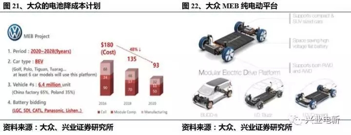 大眾的MEB平臺(tái)是其電池組未來實(shí)現(xiàn)成本大幅下降的關(guān)鍵。以大眾為例,大眾的針對(duì)電動(dòng)車專屬研發(fā)的MEB(MEBElectrictoolkit)平臺(tái)是以大眾目前的MQB平臺(tái)為基礎(chǔ),適用于電動(dòng)車的全新的模塊化平臺(tái)。MEB平臺(tái)的構(gòu)架是由底部的電池組而展開,打造更長(zhǎng)的軸距和更短的前后懸,營造出更大的內(nèi)部空間,從A到C級(jí)全系列乘用車或輕型商用車都可基于該平臺(tái)打造。電池組PACK與BMS設(shè)計(jì)也根據(jù)平臺(tái)打造,根據(jù)不同車型僅需要做一定的修繕與升級(jí),設(shè)計(jì)與研發(fā)成本被最大化的攤薄。