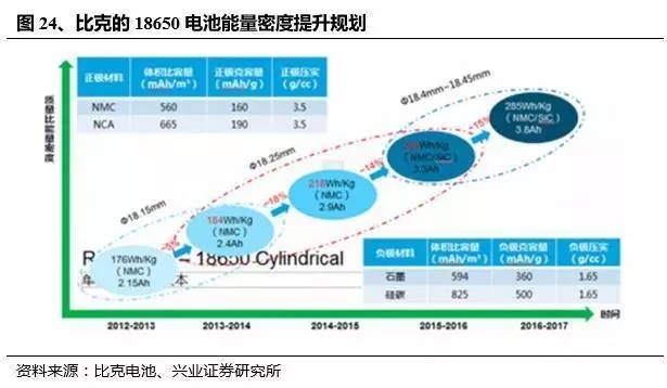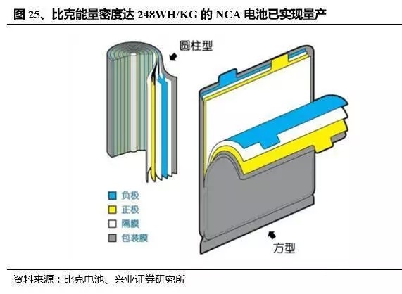 本土三元龍頭企業(yè)正在加速實(shí)現(xiàn)高比能三元電池量產(chǎn)。以本土高比能電池的代表企業(yè)比克電池為例,其16年三元出貨量0.9GWh,在本土企業(yè)中位列第2,僅次于CATL,其商業(yè)規(guī)劃具備一定代表性。根據(jù)其規(guī)劃,比克的NCM與NCA電池量產(chǎn)計(jì)劃齊頭并進(jìn),目前能量密度達(dá)248WH/KG的NCA電池已實(shí)現(xiàn)量產(chǎn),而下一代285WH/KG的NCA電池將于年內(nèi)量產(chǎn)。就能量密度來看,已經(jīng)達(dá)到特斯拉與松下水準(zhǔn)。
