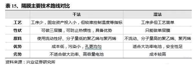 隔膜工藝主要分干法與濕法兩類。隔膜的性能決定了電池的界面結(jié)構(gòu)、內(nèi)阻等,直接影響電池的容量、循環(huán)以及安全性能等特性,性能優(yōu)異的隔膜對(duì)提高電池的綜合性能具有重要的作用。隔膜技術(shù)路線主要分為干法與濕法兩種,干法成本較低但不適合大功率電池,濕法更薄能夠滿足大功率的要求,但是成本較貴。最早的主流是干法;2015年三元產(chǎn)量上升后濕法使用較多,預(yù)計(jì)2020年干濕法占比50%,分別應(yīng)用于中低端與高端領(lǐng)域。