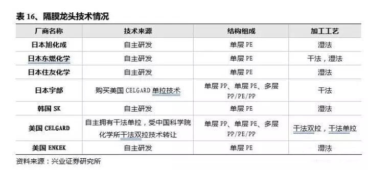 國產(chǎn)隔膜距離海外一線龍頭仍有差距。日本的旭化成是隔膜行業(yè)的龍頭,市占率在50%以上。過去1-2年,中國還有不少企業(yè)進(jìn)入市場(chǎng),但無法對(duì)龍頭地位構(gòu)成撼動(dòng)。旭化成干法現(xiàn)在可量產(chǎn)出貨的是12微米,濕法還是6-7微米。由于原料、技術(shù)、工藝與制備設(shè)備的差距,目前國產(chǎn)隔膜一致性較差,且厚度無法達(dá)到要求,干法20-40微米仍為主流。