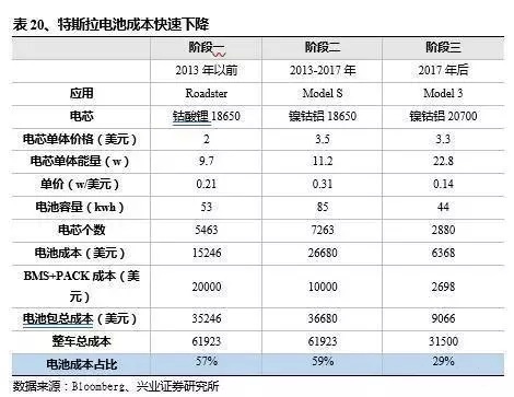 階段1:2013年以前:18650電芯價(jià)格較低僅為$2,但是BMS和PACK成本較高,電池成本占比為57%。此前松下一直為特斯拉的電池獨(dú)家供應(yīng)商,提供的電池為18650的NCA電池,單個(gè)電芯為3.1Ah,能量為11.47Wh,單價(jià)為$2左右,預(yù)計(jì)該價(jià)格為松下?lián)屨际袌?chǎng)而有意放低的價(jià)格。以85kwh的ModelS為例,采用7263顆電芯,電池成本為$15246,特斯拉公告的BMS和PACK成本為$20000,總電池成本為$35246,2013年特斯拉年報(bào)顯示其毛利為22.5%,車子售價(jià)為$79900,其成本為$79900×(1-22.5%)=$61923,電池成本占比為$35246/$61923=57%。