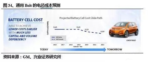 通用汽車在2015年曾經(jīng)披露過Bolt電動(dòng)車采用LGChem的電池,電芯cell的價(jià)格為145美元/kWh左右。在年度全球商業(yè)會(huì)議上,通用汽車進(jìn)一步對(duì)外展示了Bolt的電池電芯cell的成本預(yù)測(cè)。其中2016年的成本為145美元/kWh,這個(gè)數(shù)值持續(xù)到2019年,2020年會(huì)下降到120美元/kWh。到2022年,該數(shù)值繼續(xù)下降到100美元/kWh。合理推算得到通用bolt電池組成本在200美元/kWh,到2020年降至170美元/kWh。