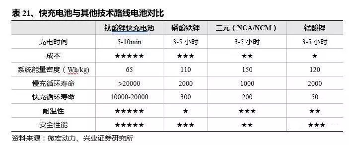 成本是快充電池進(jìn)一步拓展應(yīng)用領(lǐng)域的最大制約。國內(nèi)快充電池度電成本約為5000元,補(bǔ)貼還不足以覆蓋該部分成本,因此快充仍未成為真正意義的主流。如果快充電池能夠?qū)崿F(xiàn)較大幅度的成本下降,將迅速拓展其市場(chǎng)空間。潛在方向包括1)能量密度提升;2)批量化生產(chǎn)降成本;3)提高標(biāo)稱電壓,目前只有2.3V,而三元在3.7V。