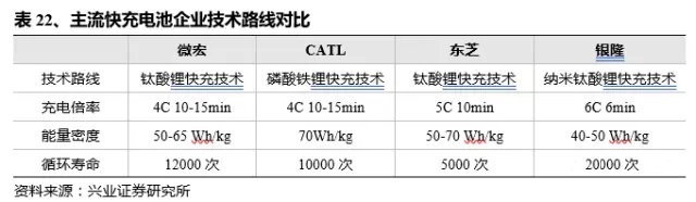 快充電池已實(shí)現(xiàn)成熟的商業(yè)化應(yīng)用。目前快充類電動(dòng)車已超過15000臺(tái),累計(jì)運(yùn)行超過10億公里,在公交車等對(duì)于充電時(shí)間要求較為嚴(yán)格的領(lǐng)域應(yīng)用較為廣泛??斐渲髁骷夹g(shù)路線有兩類,一類是以鈦酸鋰替代石墨作為負(fù)極材料,代表企業(yè)有微宏、銀隆等,另一類是在磷酸鐵鋰體系下采用快充型石墨作為負(fù)極,代表企業(yè)為CATL。