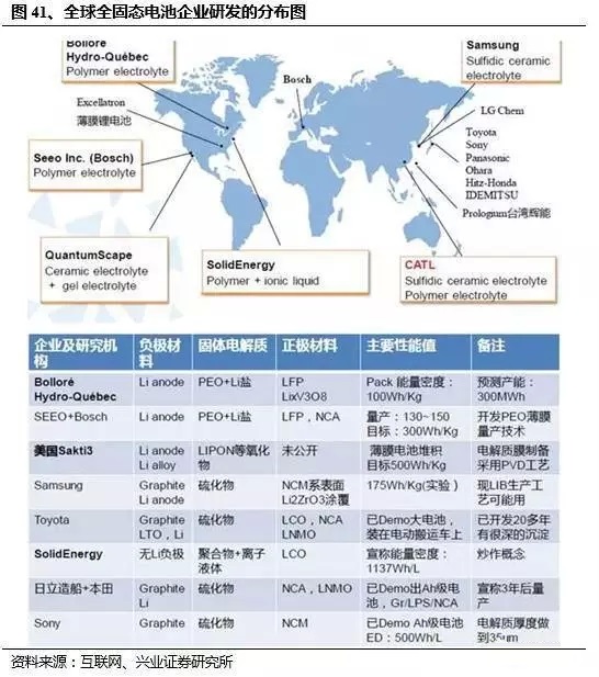 固態(tài)電池:高比能量+不燃燒。工作原理上固態(tài)鋰電池和傳統(tǒng)的鋰電池并無區(qū)別,只是電解質(zhì)從液態(tài)變?yōu)楣虘B(tài)。固態(tài)電池的優(yōu)勢(shì)在于:1)能量密度:固態(tài)電池不再使用石墨負(fù)極,而是直接使用金屬鋰負(fù)極,大大減輕負(fù)極材料的用量,使得整個(gè)電池的能量密度有明顯提高。目前實(shí)驗(yàn)室已經(jīng)可以小規(guī)模批量試制出能量密度為300-400Wh/kg的全固態(tài)電池。2)安全性:固態(tài)電池不會(huì)在高溫下發(fā)生副反應(yīng),不會(huì)因產(chǎn)生氣體而發(fā)生燃燒。目前豐田、松下、三星、三菱以及國內(nèi)的寧德時(shí)代等電池行業(yè)領(lǐng)軍企業(yè)都已經(jīng)積極布局固態(tài)電池的儲(chǔ)備研發(fā)。