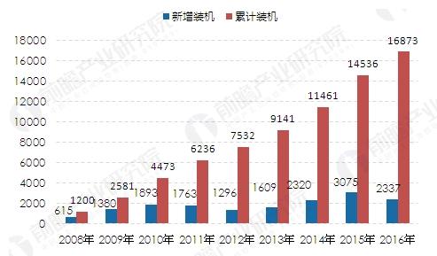 2008-2016年中國(guó)新增及累計(jì)風(fēng)電裝機(jī)容量(單位:萬(wàn)千瓦)