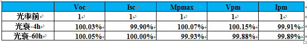 nPERT雙面電池采用N型硅作襯底,具有少子壽命高、無光致衰減等優(yōu)點。常規(guī)P型電池由于使用硼摻雜的硅襯底,長時間光照后易形成硼氧鍵,在基體中捕獲電子形成復合中心,導致3~4%的功率衰減;而nPERT電池使用N型硅襯底,磷摻雜的基體使得電池幾乎無光致衰減。我們對nPERT電池進行了光衰實驗驗證,如表1結(jié)果所示,光照60h后效率衰減僅0.11%,無光致衰減的特點能有效保證系統(tǒng)端的功率輸出和發(fā)電量。
