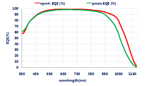 通過EQE測試結(jié)果可知(如圖2),相比于P型常規(guī)電池,nPERT電池具有更好的長波響應,可將更多長波長的光吸收,尤其是制備成雙玻組件后背面可更高效率的吸收反射光和散射光。