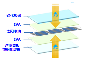 2013年以來,隨著國內(nèi)外前期投資的光伏電站的陸續(xù)并網(wǎng)發(fā)電并運行一段時間后,國內(nèi)外電站的質(zhì)量問題時有出現(xiàn)。由于某些有機材料的壽命較短、耐候性較差,光伏組件中的EVA膠膜和背板的質(zhì)量開始被高度關(guān)注,水汽穿透背板導致劣質(zhì)EVA樹脂快速降解有密切的關(guān)系,EVA樹脂遇水即開始緩慢分解,其分解產(chǎn)物含醋酸,醋酸腐蝕光伏電池上的銀柵線、匯流帶等,使組件的發(fā)電效率逐年下降。為了規(guī)避這一問題,雙玻組件為高品質(zhì)光伏電站的較為理想的解決方案之一,但雙玻組件的電池片間漏光導致組件功率損失較大,組件正面功率相比常規(guī)背板偏低;同時,無框雙玻組件對封裝材料和封裝工藝要求較高。