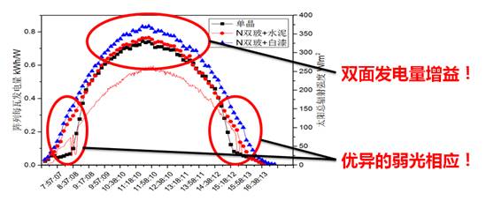 (2)弱光相應好:由于nPERT電池本身具有長波響應好的特點,結(jié)合雙玻組件雙面受光條件,可在早晨和傍晚實現(xiàn)發(fā)電量的增益,下圖為三組光伏陣列單日的發(fā)電量跟蹤曲線,將nPERT雙玻組件在兩種不同反射條件下與常規(guī)P型單晶進行比較,可見在早晚兩個時段,nPERT雙玻組件有更好的弱光發(fā)電量保證。