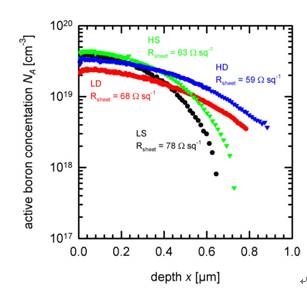 背面N+的形成可以有熱擴散的形式也可以用離子注入的形式。若是使用熱擴散的方式,則工藝過程中要用到掩膜工藝,增加了工藝的成本及復雜性。離子注入是一種能夠單面摻雜且均勻性很好的半導體制造工藝,通過調(diào)節(jié)注入?yún)?shù)和配套的退火工藝可以達到所需要設計的結(jié)形及結(jié)深,而且可以省去去磷/硼硅玻璃(P/BSG)步驟,簡化了制造工藝。如圖7所示為四種不同工藝下發(fā)射結(jié)的濃度分布情況[6]: