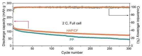 采用新型羥基磷灰石超長納米線基耐高溫電池隔膜組裝的全電池具有更高的比容量和更穩(wěn)定的循環(huán)性能