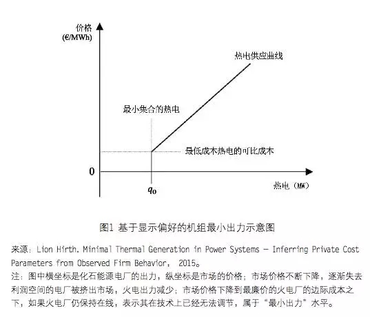 ? 向下的調(diào)峰涉及最小出力問題, 這方面的討論仍舊是非常不透明的。如果系統(tǒng)所有的機組都實現(xiàn)了最小出力,那么 證明系統(tǒng)存在嚴(yán)重的供大于求,價格需要大幅跌落,以將盡可能多的出力擠出。電 價不斷下降到低于燃料成本的程度(比如 0.1 元 / 千瓦時—0.15 元 / 千瓦時),靈活 的煤電就寧愿盡可能地停機,而不愿意留在序列里承擔(dān)虧錢的損失了。那么剩下的, 就是的確“往下調(diào)不了”或者不足夠靈活參與下一階段市場的那部分。這種基于“顯 示偏好”的最小出力,往往比測算出的技術(shù)性最小出力要準(zhǔn)確得多(見圖1)。