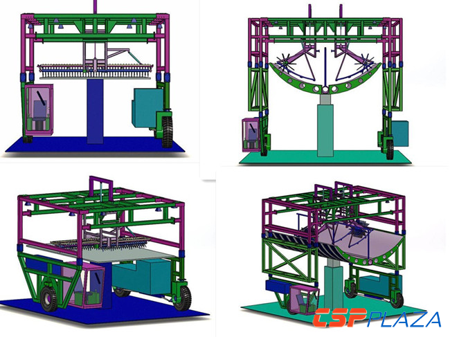 此外,國(guó)內(nèi)清洗車(chē)供應(yīng)商寧波跨越太陽(yáng)能板清洗車(chē)有限公司開(kāi)發(fā)了一款可應(yīng)用于塔式和槽式光熱電站的跨越式清洗車(chē)輛,采用高壓柔條刷滾水洗、高壓吹風(fēng)和高壓除塵三種組合方式,具有整機(jī)結(jié)構(gòu)簡(jiǎn)單、操作控制方便、晃動(dòng)損傷減輕、運(yùn)行平穩(wěn)高效、轉(zhuǎn)彎靈活方便及場(chǎng)地利用率高的特點(diǎn),同時(shí),該公司還自主研發(fā)了適用于沙漠等軟土地面的履帶式龍門(mén)清洗車(chē)。此外,針對(duì)西北地區(qū)寒冷條件下鏡面易結(jié)冰的現(xiàn)象,其還提出了采用暖風(fēng)吹塵干洗的措施。(如下圖所示)