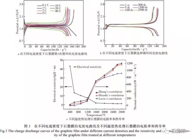 通過炭化、高溫石墨化制備石墨薄膜的工藝,已經(jīng)制得了電阻率小于1.1μ?·m、熱導(dǎo)率達(dá)到1100 W/(m·K)的高定向石墨薄膜,但達(dá)到石墨烯的理論熱導(dǎo)率還有很大的空間。在不同電流密度下制備石墨膜的第1次循環(huán)(見圖3a)和選擇的循環(huán)(見圖3b)的充放電曲線及不同溫度熱處理石墨膜的電阻率和熱導(dǎo)率見圖4,發(fā)現(xiàn)石墨膜具有良好的充放電性,熱導(dǎo)率高達(dá)1100~1200 W/(m·K)。