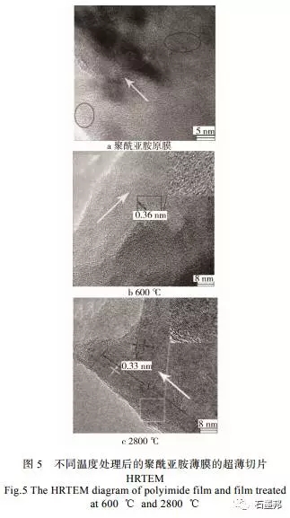 石墨膜局部形態(tài)見圖5,其中白色箭頭方向為石墨烯薄膜拉伸平面方向,可以看出,在聚酰亞胺薄膜前驅(qū)體中,類似石墨烯片層結(jié)構(gòu)似乎已經(jīng)形成,而且通過預(yù)氧化和碳化后的組織結(jié)構(gòu)具有一定遺傳性,然而聚酰亞胺前驅(qū)體的超分子結(jié)構(gòu)是一線性分子鏈結(jié)構(gòu),通過預(yù)氧化(環(huán)化和交聯(lián)形成 耐熱梯形結(jié)構(gòu))和碳化(交聯(lián)和芳構(gòu)化)后才形成最終類石墨烯片層結(jié)構(gòu),并且類石墨烯片層與類石墨烯片層之間有一定的狹長針狀空隙,這種結(jié)構(gòu)演變規(guī)律是怎樣的,空隙是怎樣影響類石墨烯片層結(jié)構(gòu)形成的,怎樣控制類石墨烯薄膜的厚度和長度,涉及到各個階段的工藝參數(shù)怎樣優(yōu)化,怎樣建立相應(yīng)各個階段的原子排列結(jié)構(gòu)模型,結(jié)構(gòu)和導(dǎo)熱性能的相關(guān)性是怎樣的,要真正弄清這些微觀結(jié)構(gòu)的形成和演變機制,系統(tǒng)全面的研究工作尚須設(shè)計和實施。