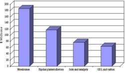 BCC提供的一份技術(shù)市場研究報(bào)告(報(bào)告編號:FCB035D)顯示:2012年P(guān)EMFC/MEA全球市場達(dá)到了4.44億美元。報(bào)告將PEMFC/MEA市場劃分為四個(gè)部分:膜、雙極板、催化劑、氣體擴(kuò)散層等。該報(bào)告依據(jù)2011年和2012年的市場數(shù)據(jù),得出五年的復(fù)合年均增長率(CAGR)為22.1%,并由此計(jì)算膜電極組件市場到2017年時(shí)將達(dá)到12億美元,份額最大的膜復(fù)合年均增長率為21.3%,2017年將達(dá)到4.89億美元;其次為雙極板2012年價(jià)值1.17億美元,2017年預(yù)計(jì)將達(dá)到3.04億美元,復(fù)合年均增長率為21.0%。