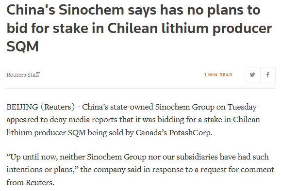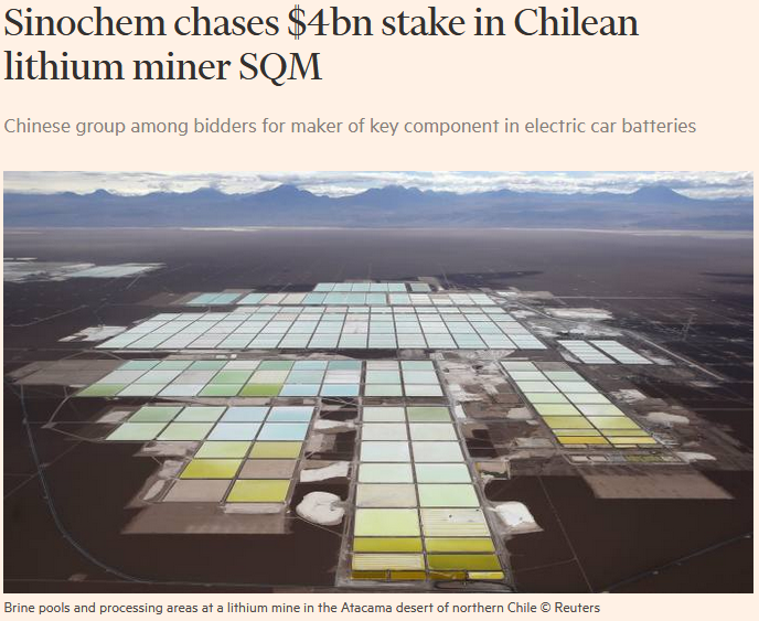 此前據(jù)英國《金融時報》(FT Times)報道,中國中化競購智利化工礦業(yè)公司價值40億美元的股權(quán),該公司為世界上最大的鋰電池供應(yīng)商之一。競購者還有中國的私募股權(quán)投資公司金沙江創(chuàng)投,寧波杉杉,以及中國最大鋰生產(chǎn)商之一天齊鋰業(yè)。
