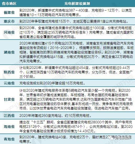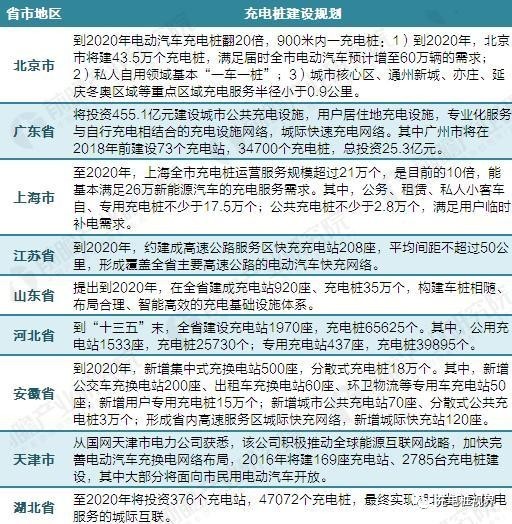 根據(jù)前瞻產(chǎn)業(yè)研究院發(fā)布的《2017-2022年中國電動汽車充電樁行業(yè)發(fā)展前景預(yù)測與投資戰(zhàn)略規(guī)劃分析報告》統(tǒng)計,目前有20余個省市發(fā)布了電動汽車充電樁規(guī)劃,匯總?cè)缦拢?