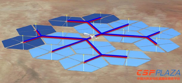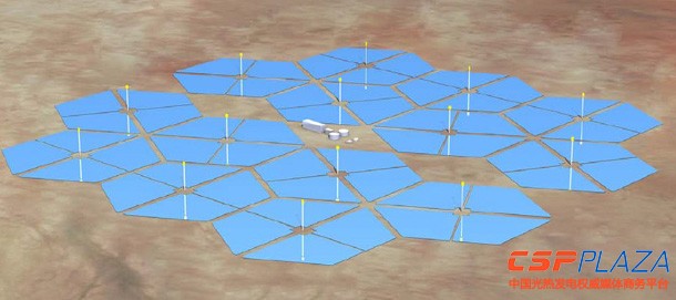 eSolar此前的鏡場設(shè)計(jì)為長方形設(shè)計(jì),兩個(gè)長方形布置的鏡場中間放置集熱塔,單個(gè)發(fā)電模塊的鏡場面積約28000平方米。新的鏡場設(shè)計(jì)采用了一種六邊形的結(jié)構(gòu),四個(gè)子鏡場圍繞一個(gè)集熱塔布置。反射鏡尺寸也隨之增加,此前的反射鏡尺寸為1.136平方米,新的設(shè)計(jì)采用了2.2平方米的反射鏡,單個(gè)集熱模塊共配裝47000面定日鏡,使得單個(gè)六邊形鏡場的集熱面積大幅增加至103000平方米,集熱塔高100米,比此前的55米的集熱塔高度也有大幅增加。