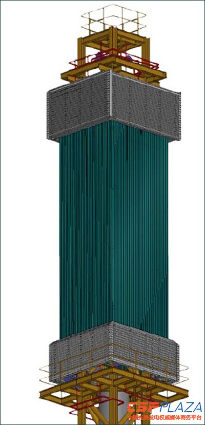加州Lancaster的5MW示范電站采用了兩家公司生產(chǎn)的不同的吸熱器,分別為Babcock & Wilcoxgs公司生產(chǎn)的外置式吸熱器和Victory Energy公司生產(chǎn)的雙向腔式吸熱器。此次新的電站設(shè)計(jì)則由eSolar和B&W公司合作,將采用B&W為其新設(shè)計(jì)的熔鹽吸熱器,依然為外置式,外形結(jié)構(gòu)與此前的設(shè)計(jì)基本相似。eSolar宣稱,此款吸熱器在工廠實(shí)現(xiàn)完全整裝,減少了在項(xiàng)目現(xiàn)場的組裝程序,更易實(shí)現(xiàn)快速安裝。吸熱器采用垂直管板和蛇型管線設(shè)計(jì),具備30秒內(nèi)的完全疏水能力,可實(shí)現(xiàn)快速啟動(dòng)。