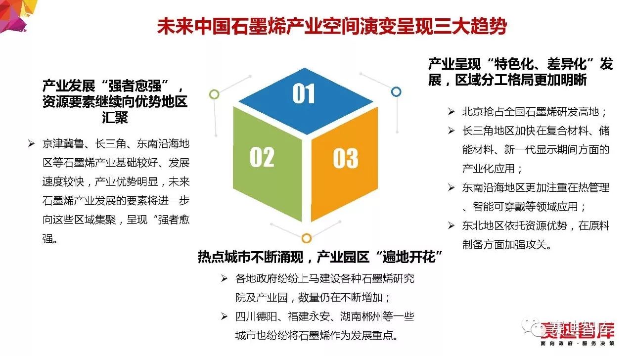 未來我國石墨烯產(chǎn)業(yè)空間發(fā)展主要呈現(xiàn)以下三大趨勢:一是產(chǎn)業(yè)發(fā)展“強者愈強”,資源要素繼續(xù)向優(yōu)勢地區(qū)匯聚;二是熱點城市不斷涌現(xiàn),產(chǎn)業(yè)園區(qū)“遍地開花”;三是產(chǎn)業(yè)呈現(xiàn)“特色化、差異化”發(fā)展,區(qū)域分工格局將更加明晰。