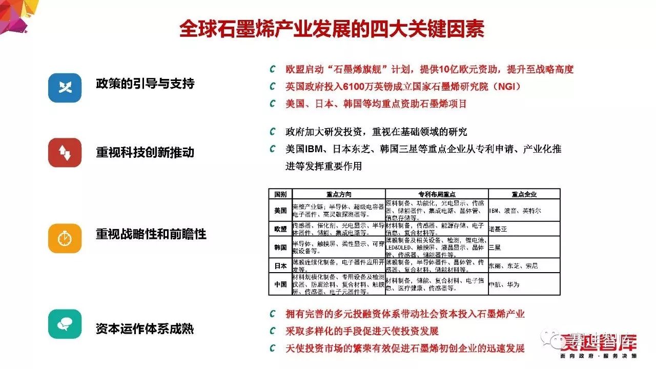 通過對英國、美國、歐盟、韓國、日本等國家和地區(qū)石墨烯產(chǎn)業(yè)發(fā)展的經(jīng)驗進行分析,可以總結出政策的引導與支持、重視科技創(chuàng)新推動、重視戰(zhàn)略性和前瞻性、成熟的資本運作體系等是石墨烯產(chǎn)業(yè)發(fā)展成功的關鍵因素。