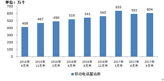 2015-2017年9月移動電話基站數(shù)發(fā)展情況