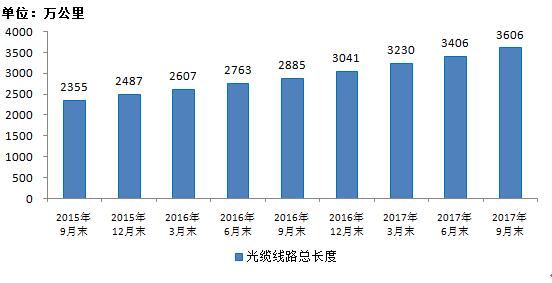 2015-2017年9月光纜線路總長度發(fā)展情況