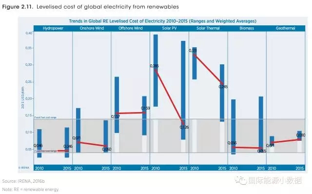 光伏:2010=0.285美元/千瓦時(shí);2015年=0.126美元/千瓦時(shí)——下降幅度55.8%