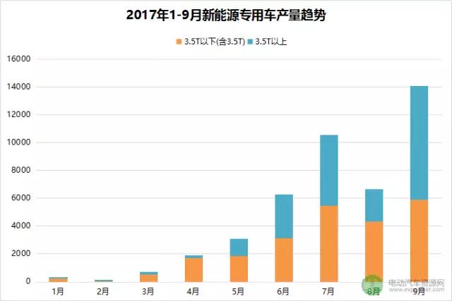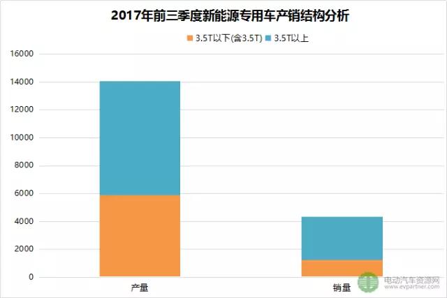 2017年前三季度,3.5T以下(含3.5T)的新能源專用車產(chǎn)銷分別完成23237臺和10814臺,3.5T以上的新能源專用車產(chǎn)銷分別完成20405臺和8405臺。