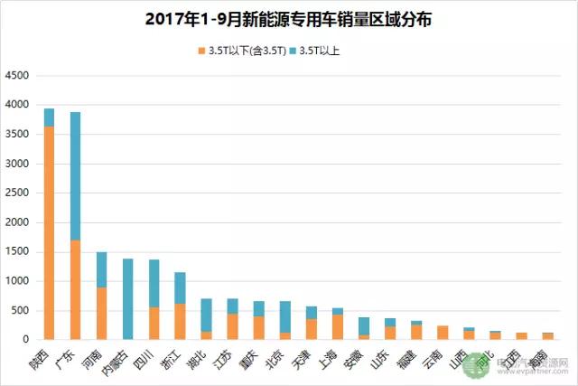 從區(qū)域銷售情況看,2017年前三季度共有陜西、廣東、河南、內(nèi)蒙古、四川、浙江六個(gè)省份銷量突破1000臺,其中陜西省銷量最多,達(dá)到3938臺。